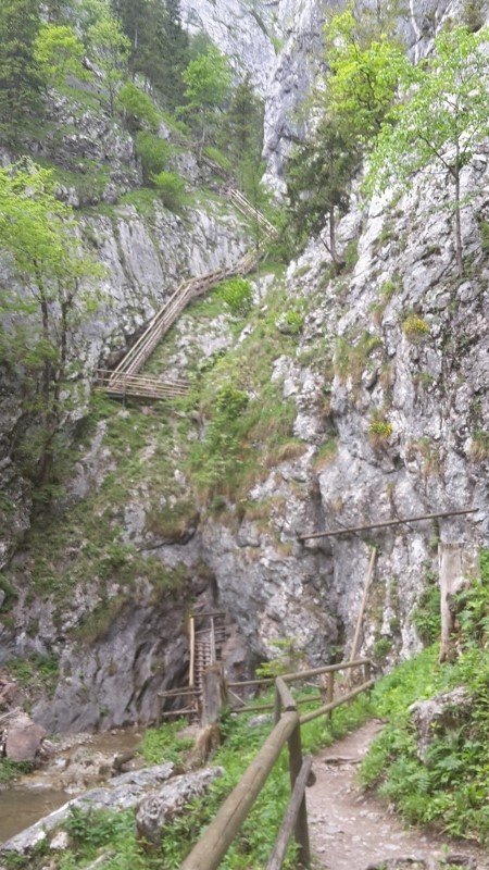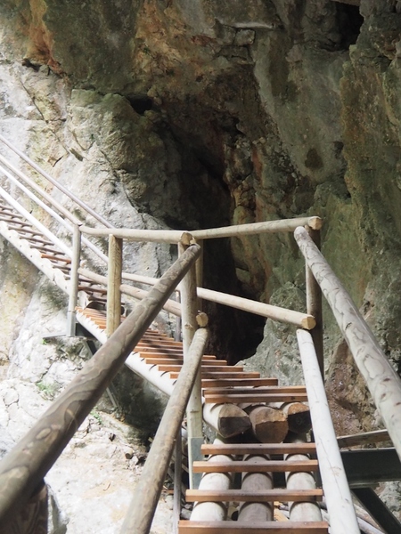 Dauert ein wenig bis wir in Mixnitz, am Eingangsparkplatz zur Klamm ankommen, oder anders gesagt, es ist schon 16:00 Uhr. Und es grummelt am Firmament. Und „nix is“ mit gemütlicher Wanderung! Erst mal 250 Höhenmeter steil bergauf zum Eingang der Klamm. Kommen uns vor wie „Geistergeher“, alles kommt entgegen. Am Eingang sind wir dann ganz allein. Sogar der Ticketverkäufer hat schon aufgegeben! Tja, und dann sehen wir die Klamm: sie führt senkrecht bergauf. Mit steilen Holzleitern und Brücken hat man sie gangbar gemacht. Tolle Pionierleistung und nicht unbedingt geeignet für jedermann.
