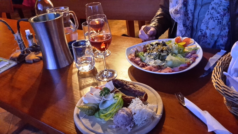 Gewitter sind durchgezogen, auf den Straßen liegt der Hagel, die Berge sind weiß davon und wir finden einen netten Platz beim Gasthaus Harmonika Waldi mit dem singenden Wirt und genießen letztmals die hervorragende steirische Küche.